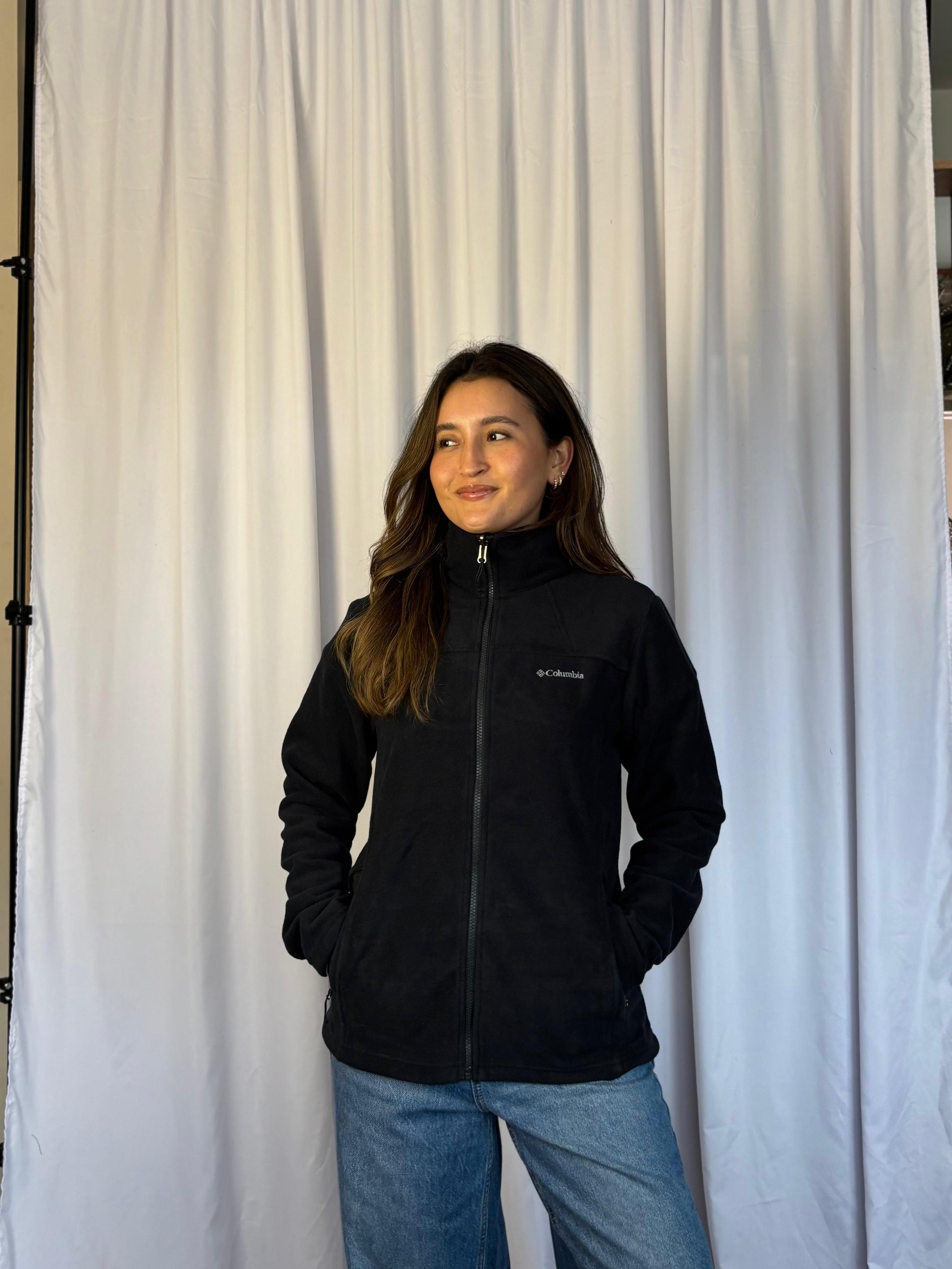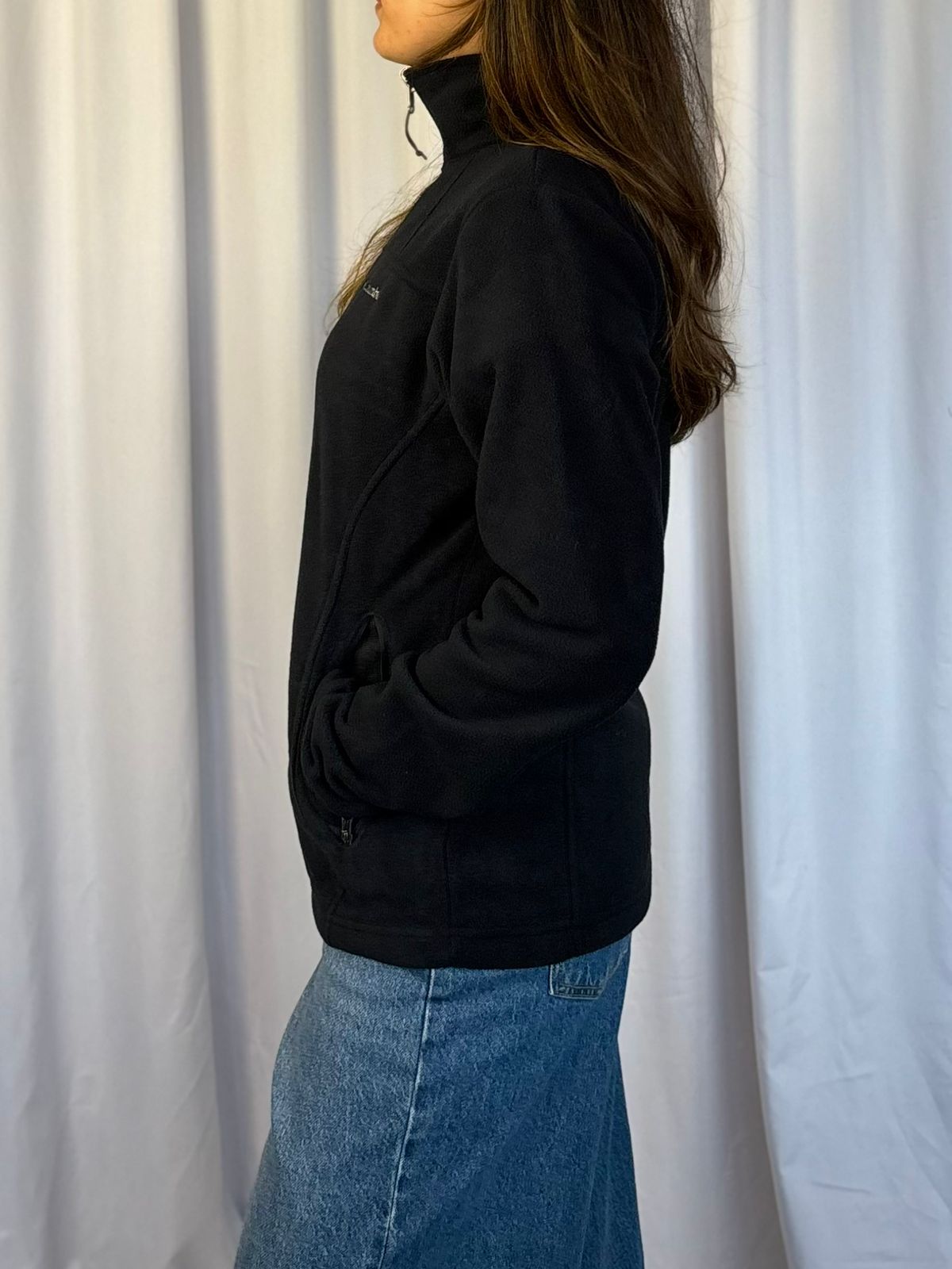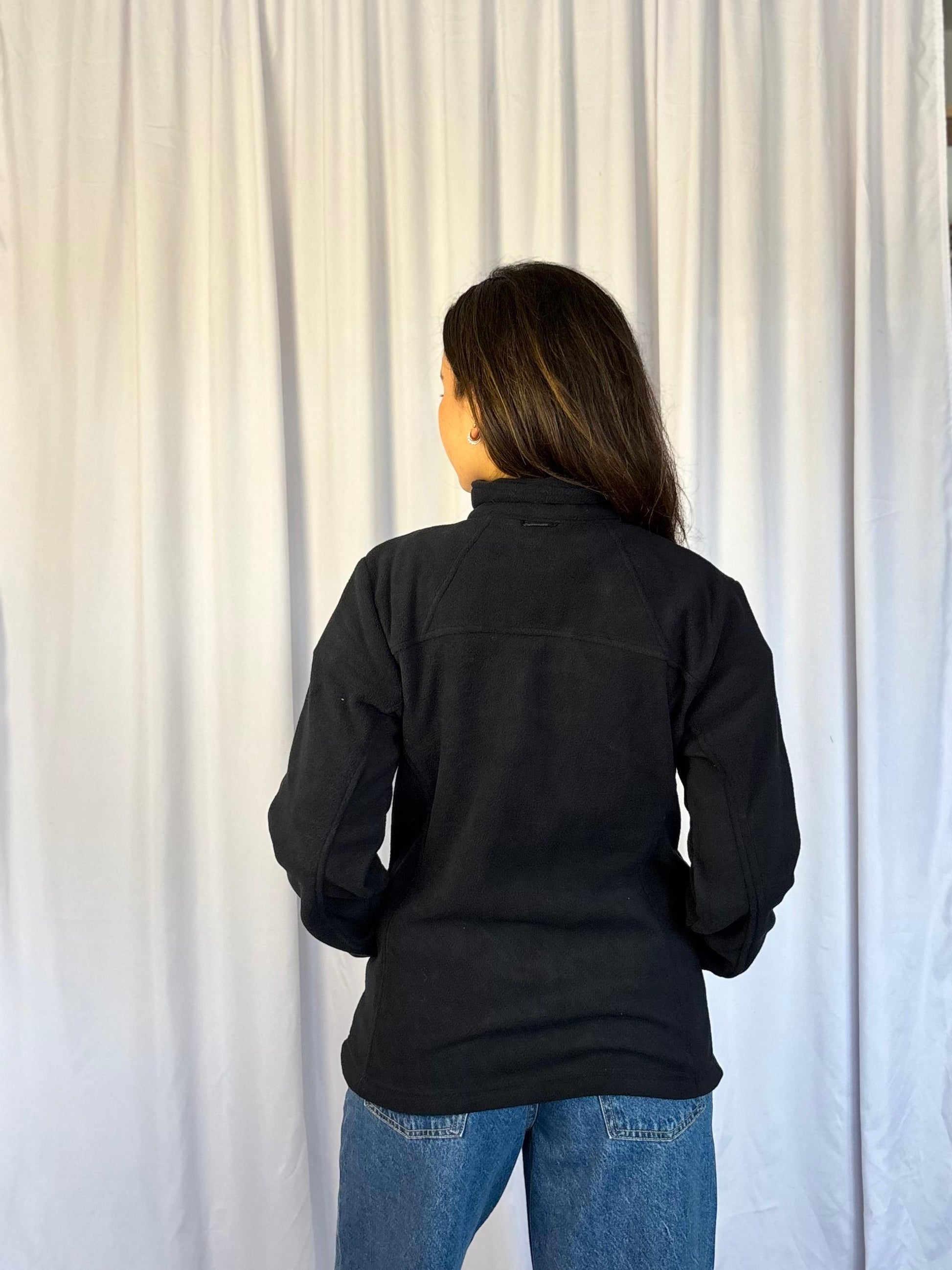 Polar para mujer cierre completo negro, cuello alto, bolsillo a los costados.