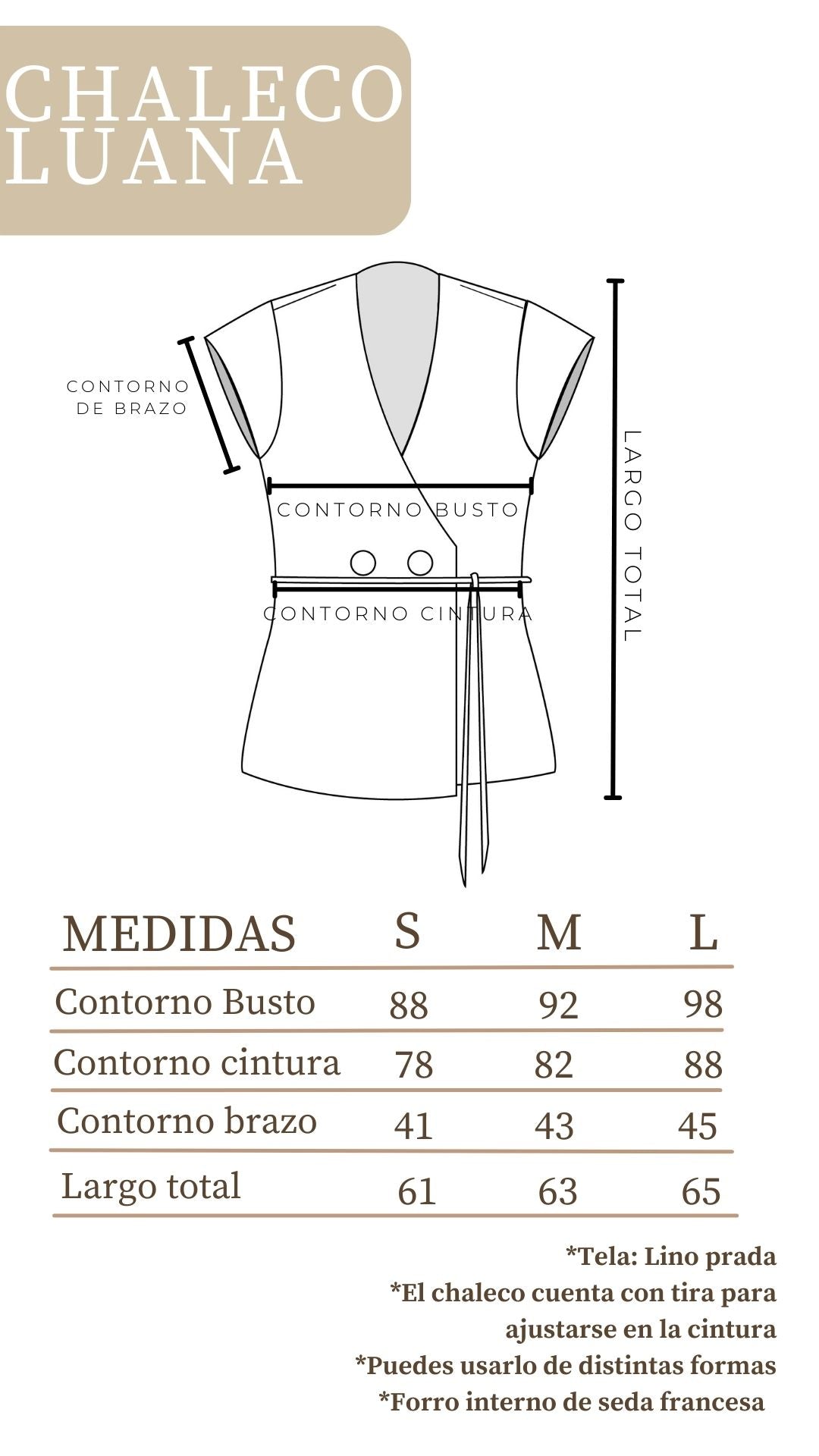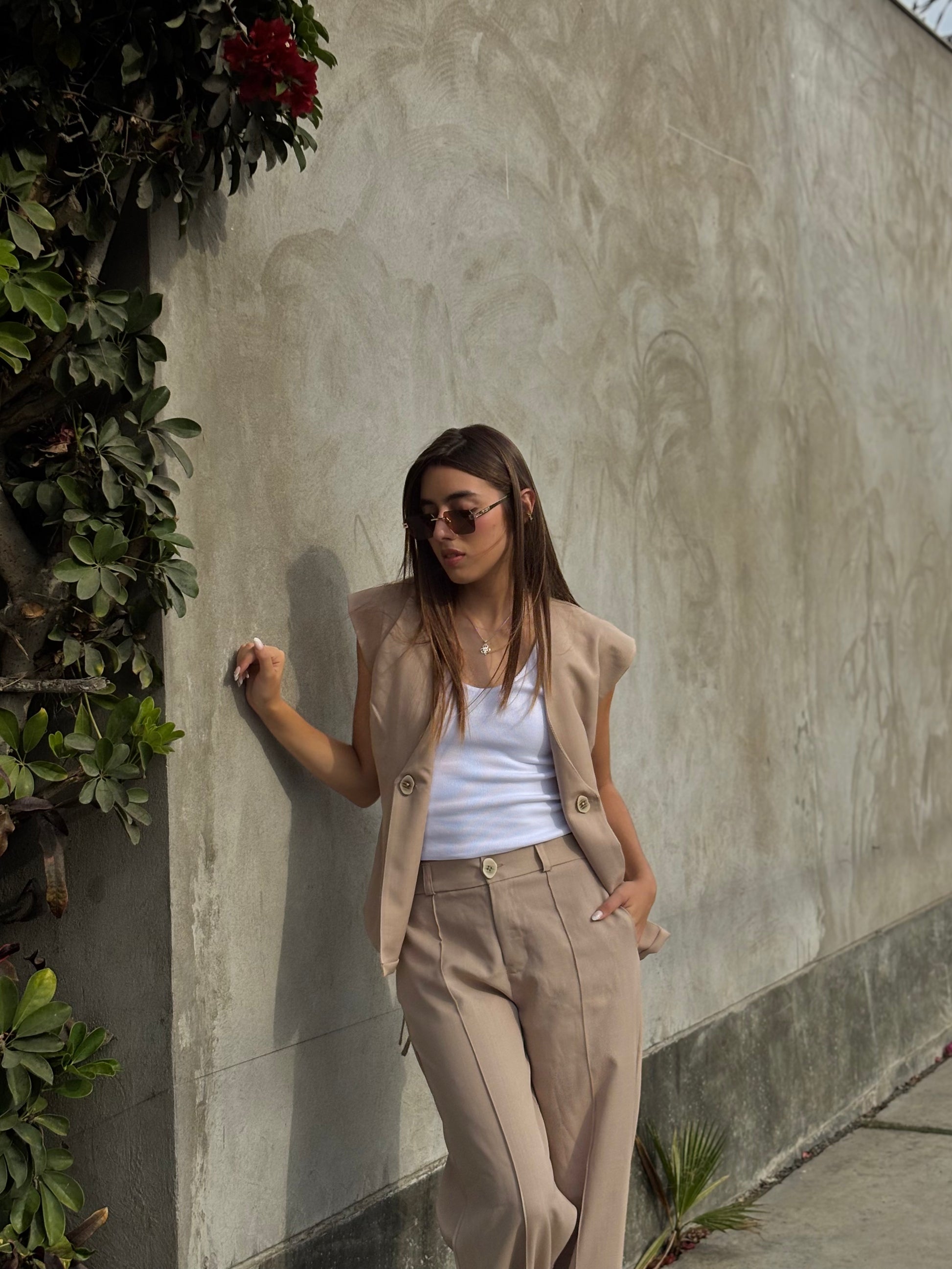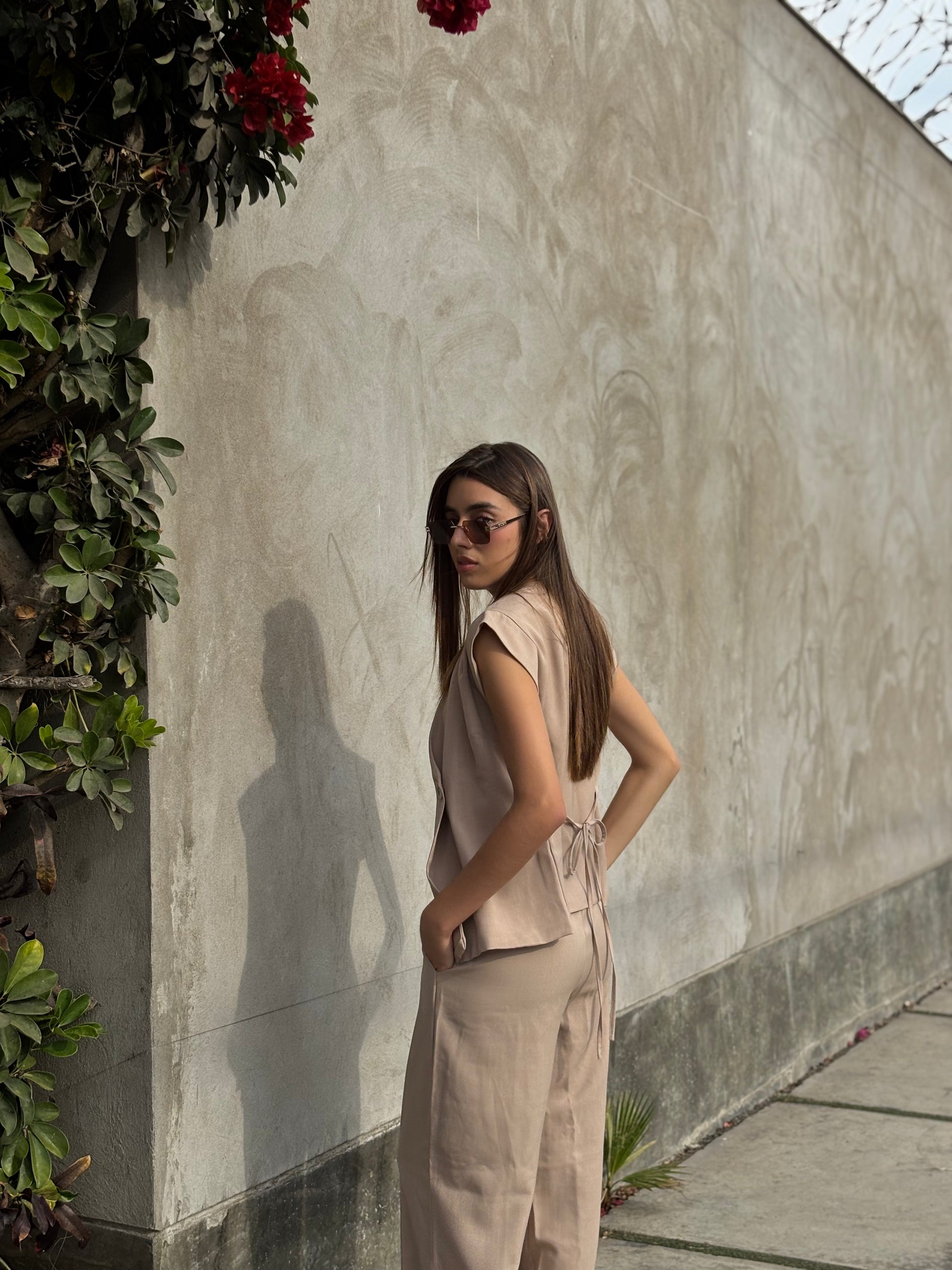 Chaleco Luana, confeccionado en la tela Lino Prada, que tiene un acabado ligero y fresco. Su diseño con escote en V y botones frontales estiliza y permite un ajuste personalizado a la cintura para realzar tu silueta de forma natural. El chaleco es el match perfecto para el pantalón Luana.
