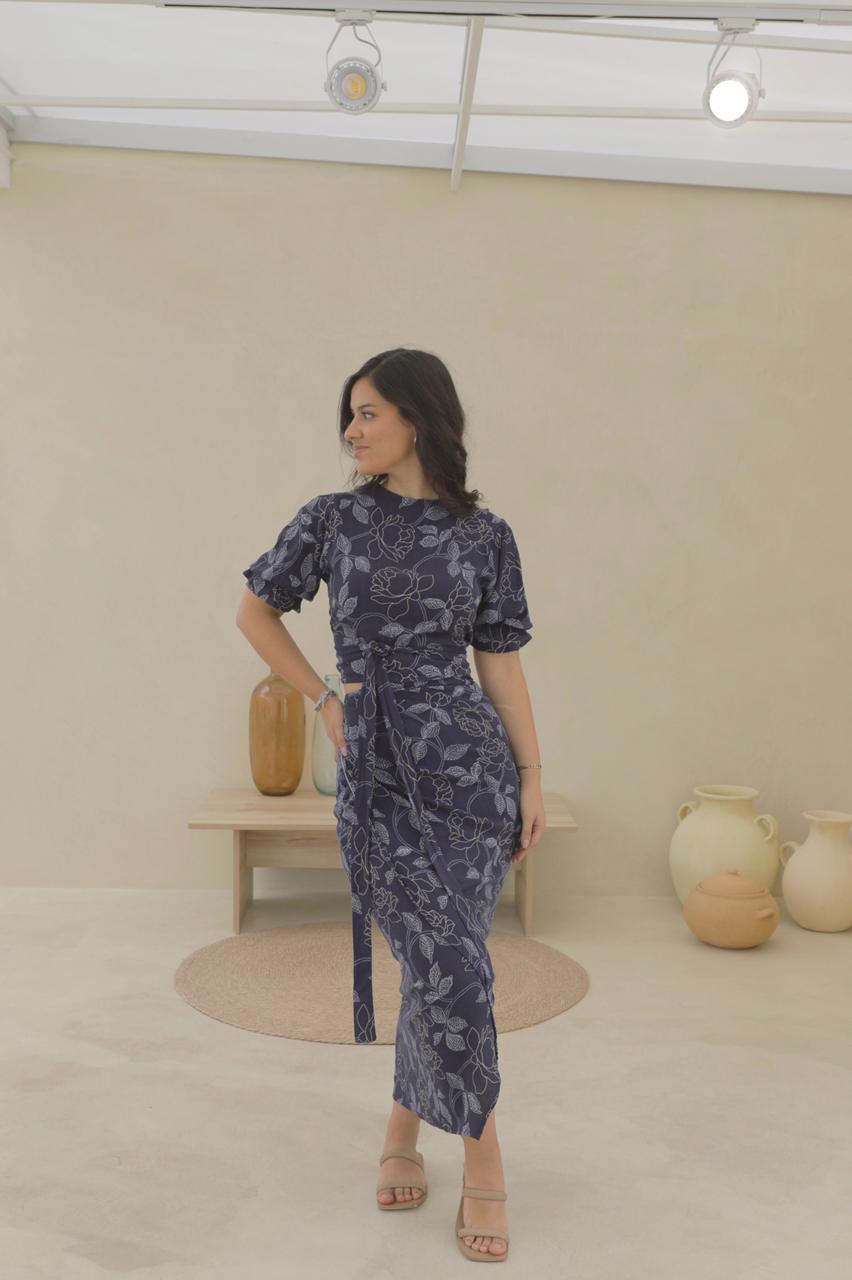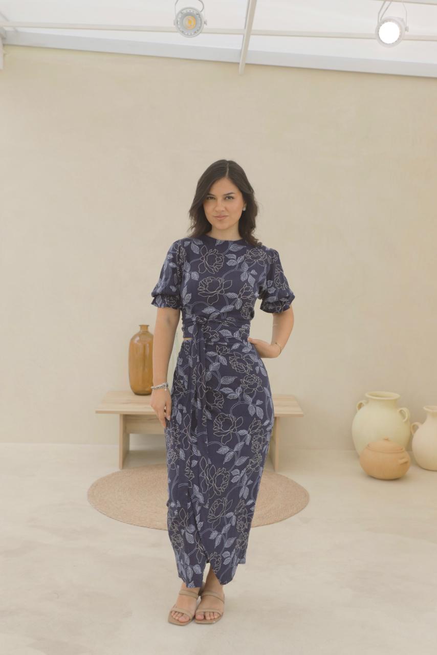 Conjunto de falda envolvente y blusa con mangas abullonadas, ambas piezas podrás amarrarla de distintas formas.