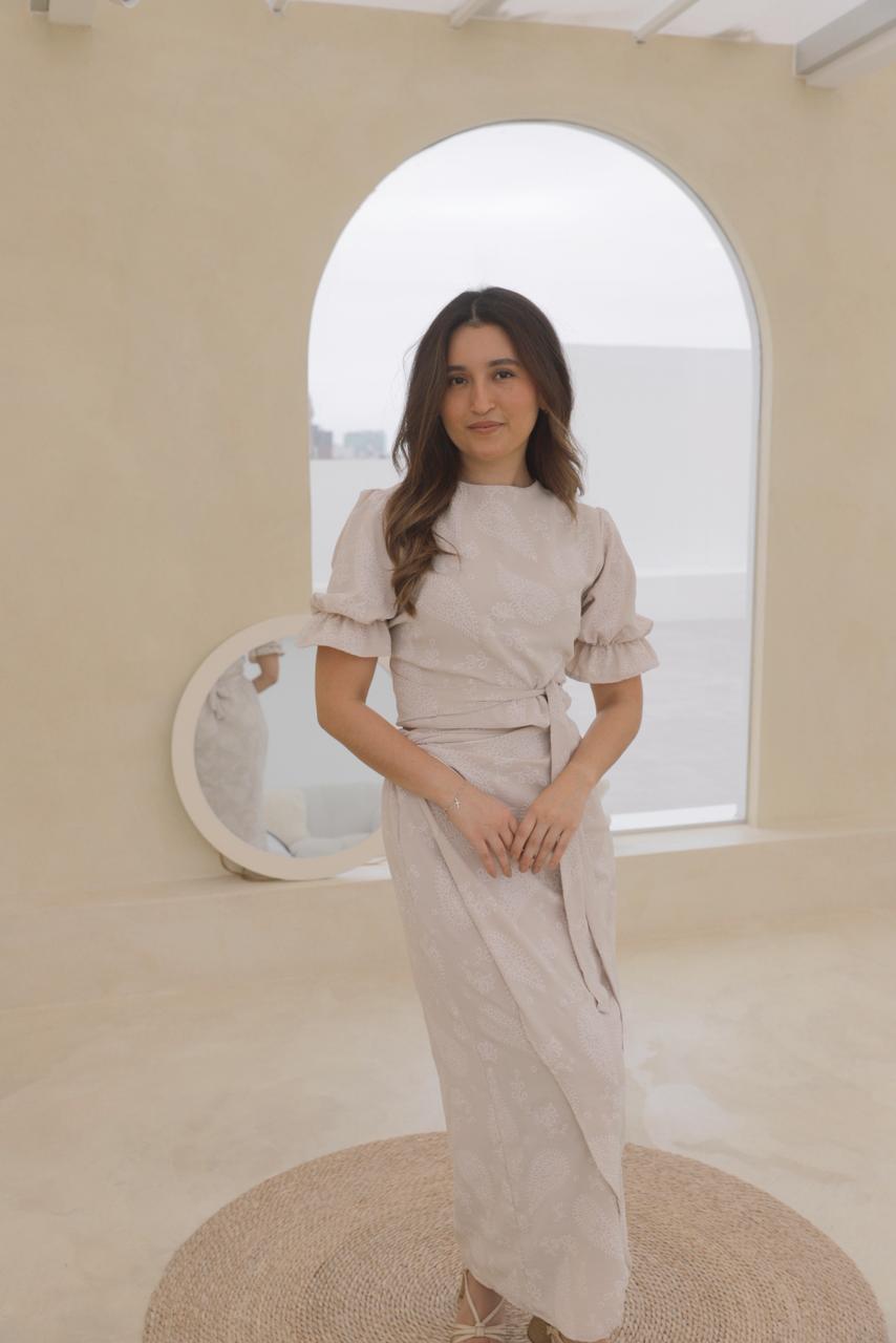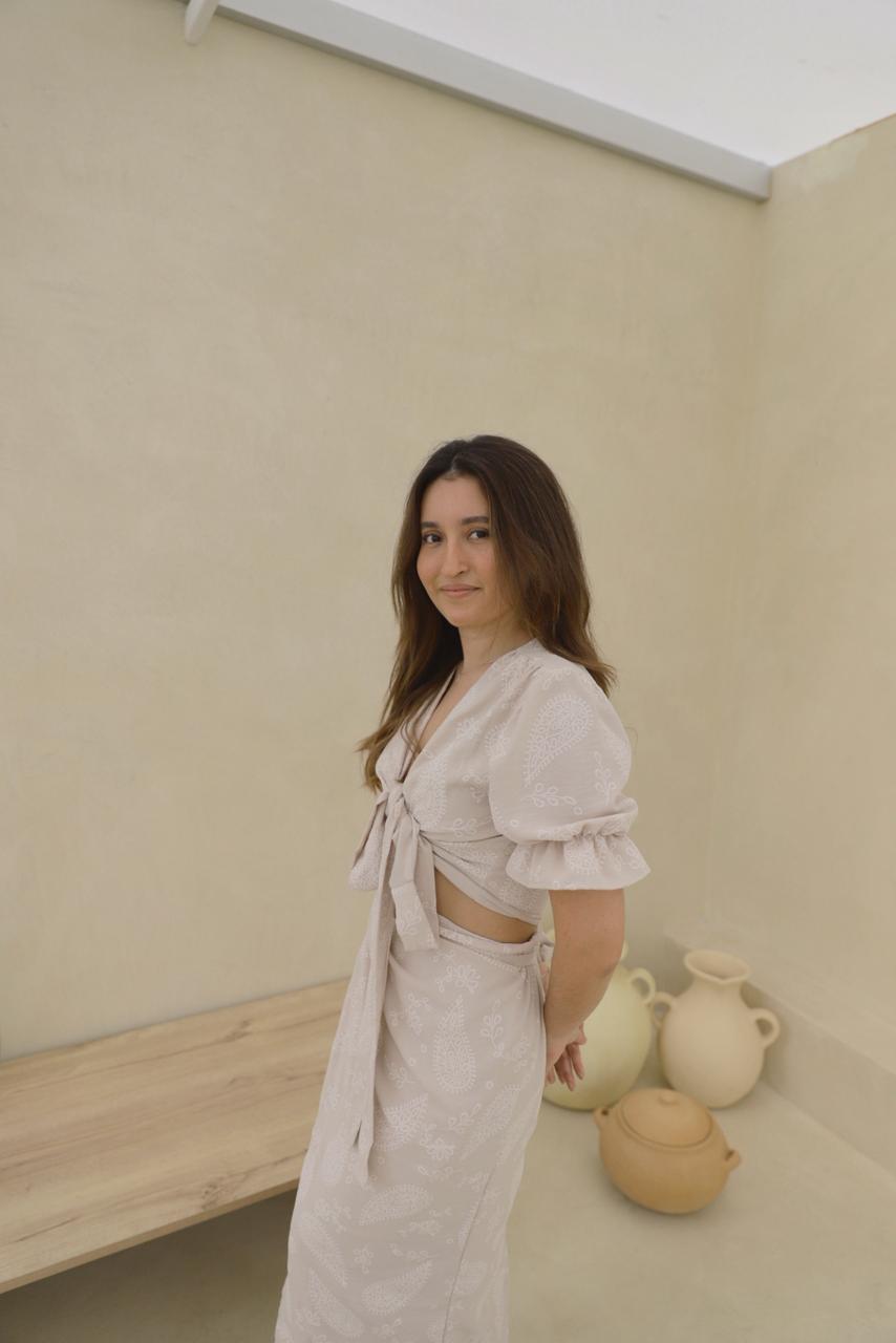Conjunto de falda envolvente y blusa con mangas abullonadas, ambas piezas podrás amarrarla de distintas formas.