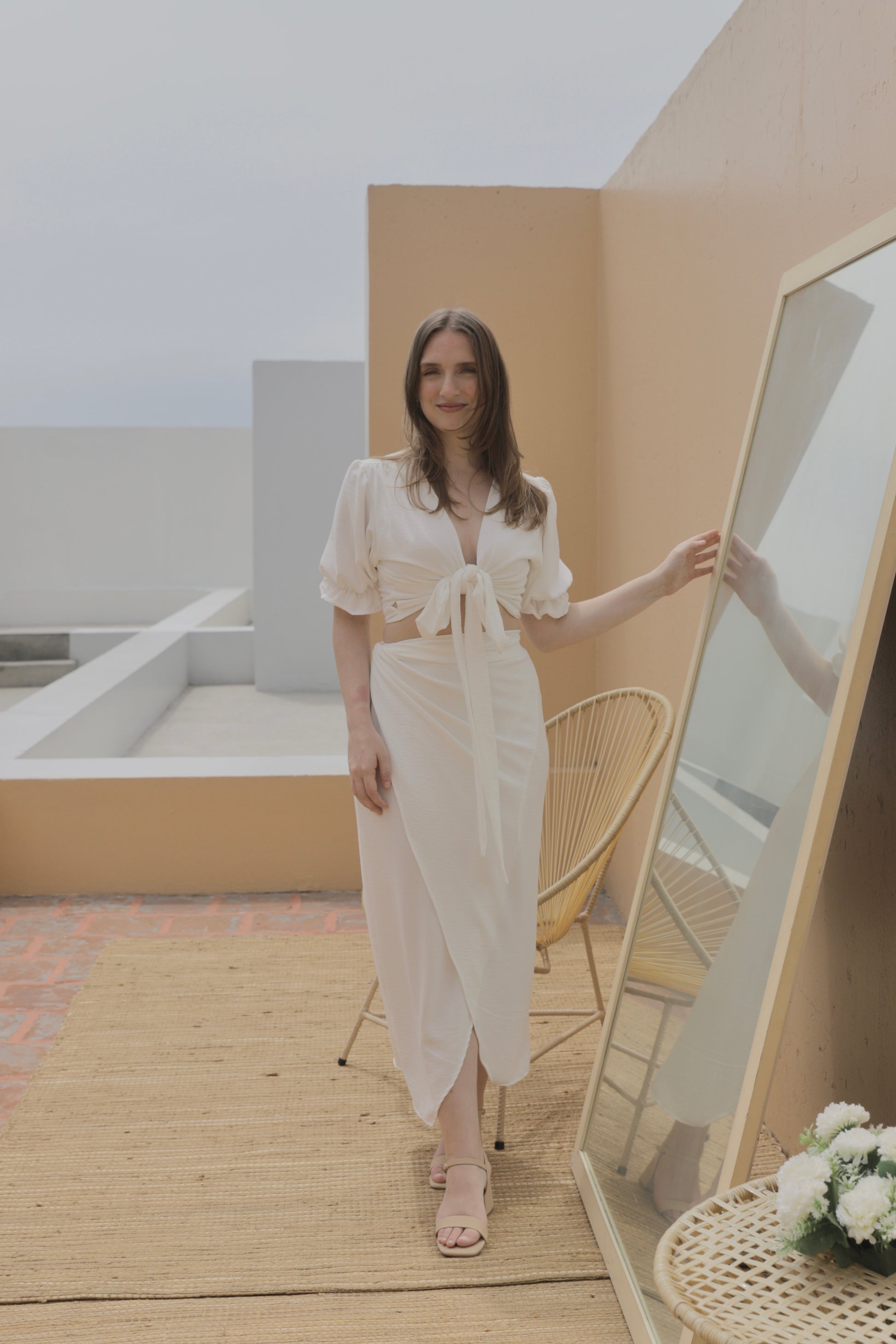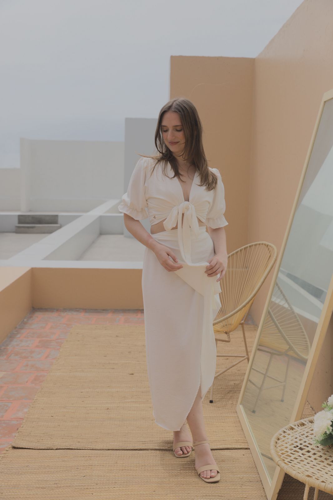 Conjunto de falda envolvente y blusa con mangas abullonadas, ambas piezas podrás amarrarla de distintas formas.