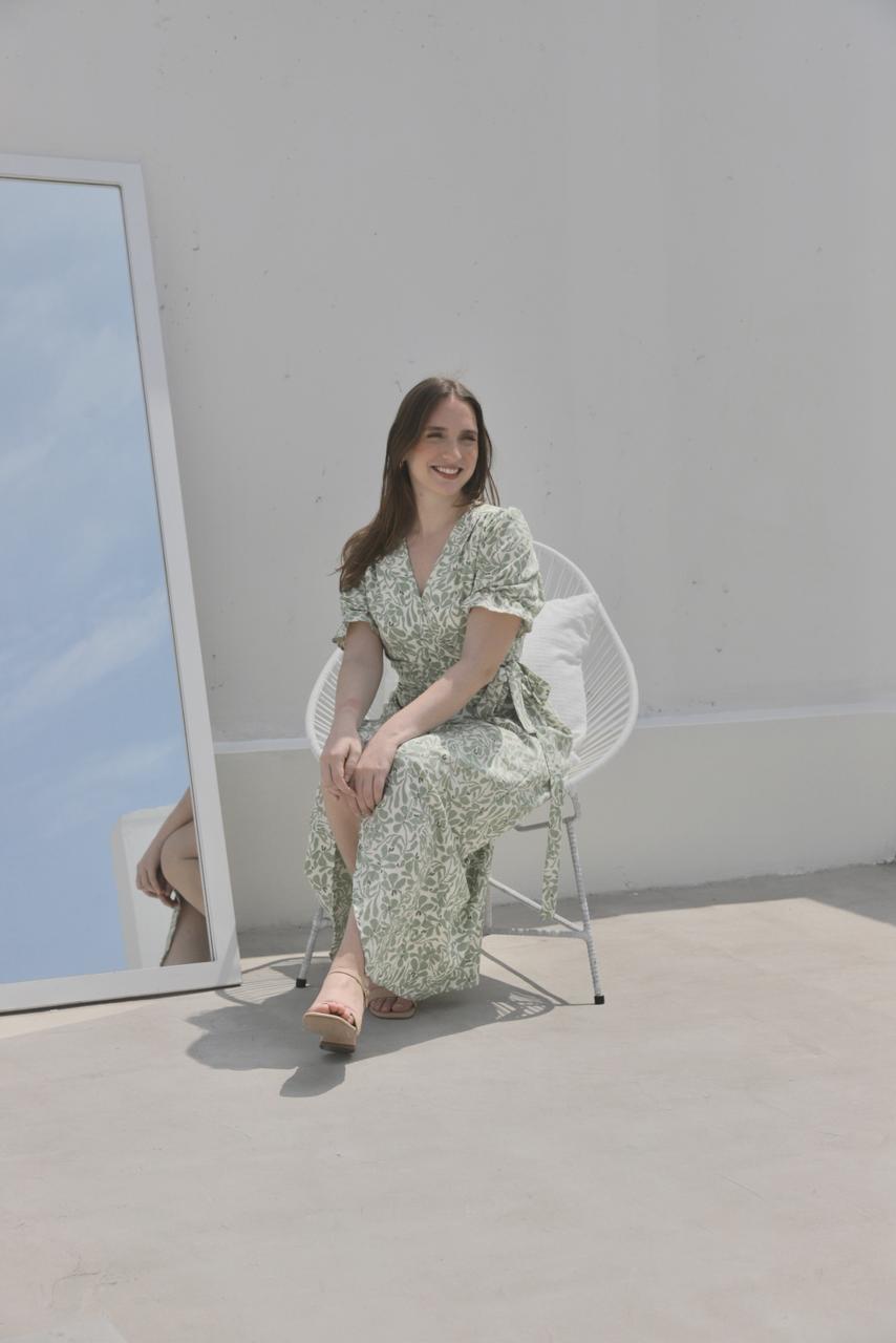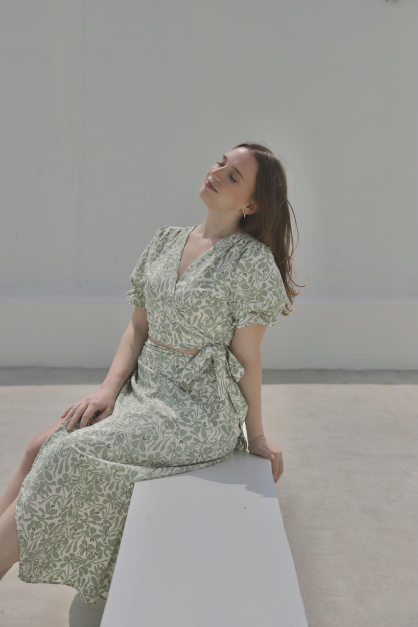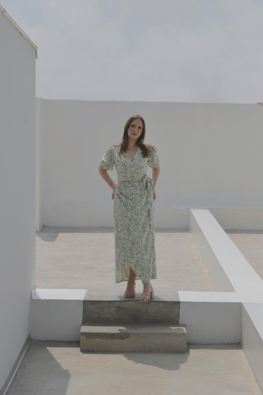 Conjunto de falda envolvente y blusa con mangas abullonadas, ambas piezas podrás amarrarla de distintas formas.