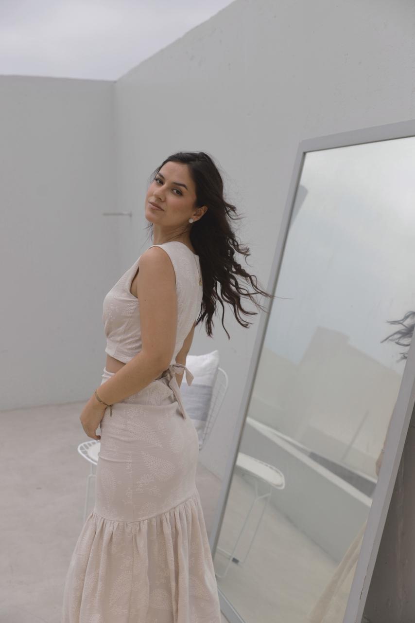 Conjunto de Falda con corte sirena y Blusa envolvente que podrás amarrar de distintas formas.