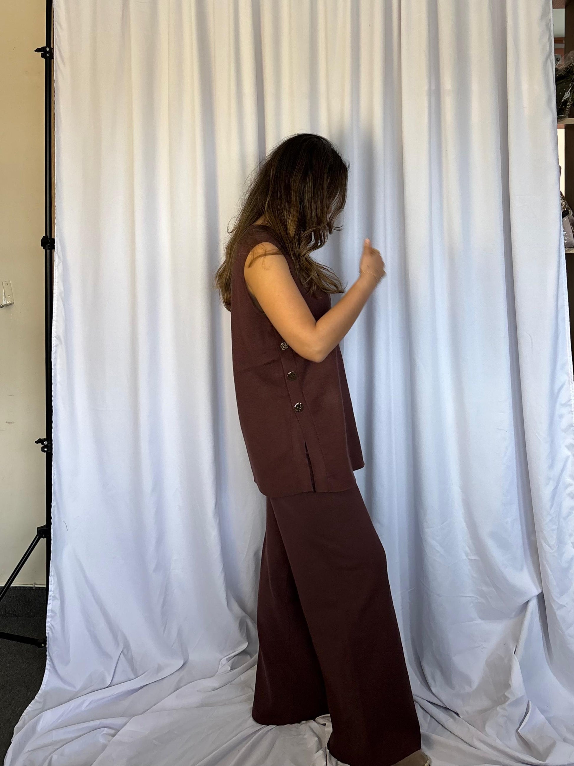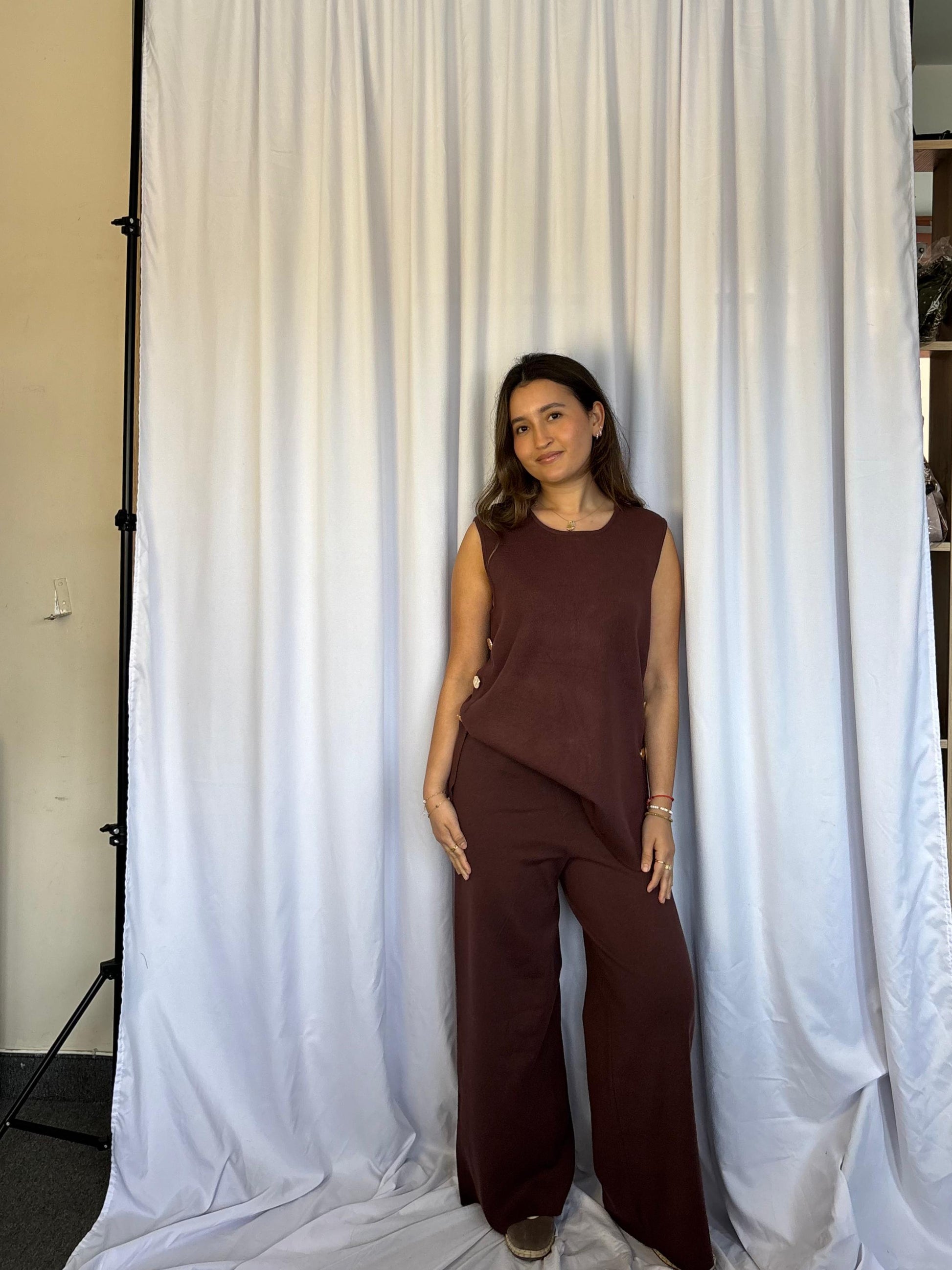 Conjunto tejido marrón, blusa manga cero y pantalón tejido.