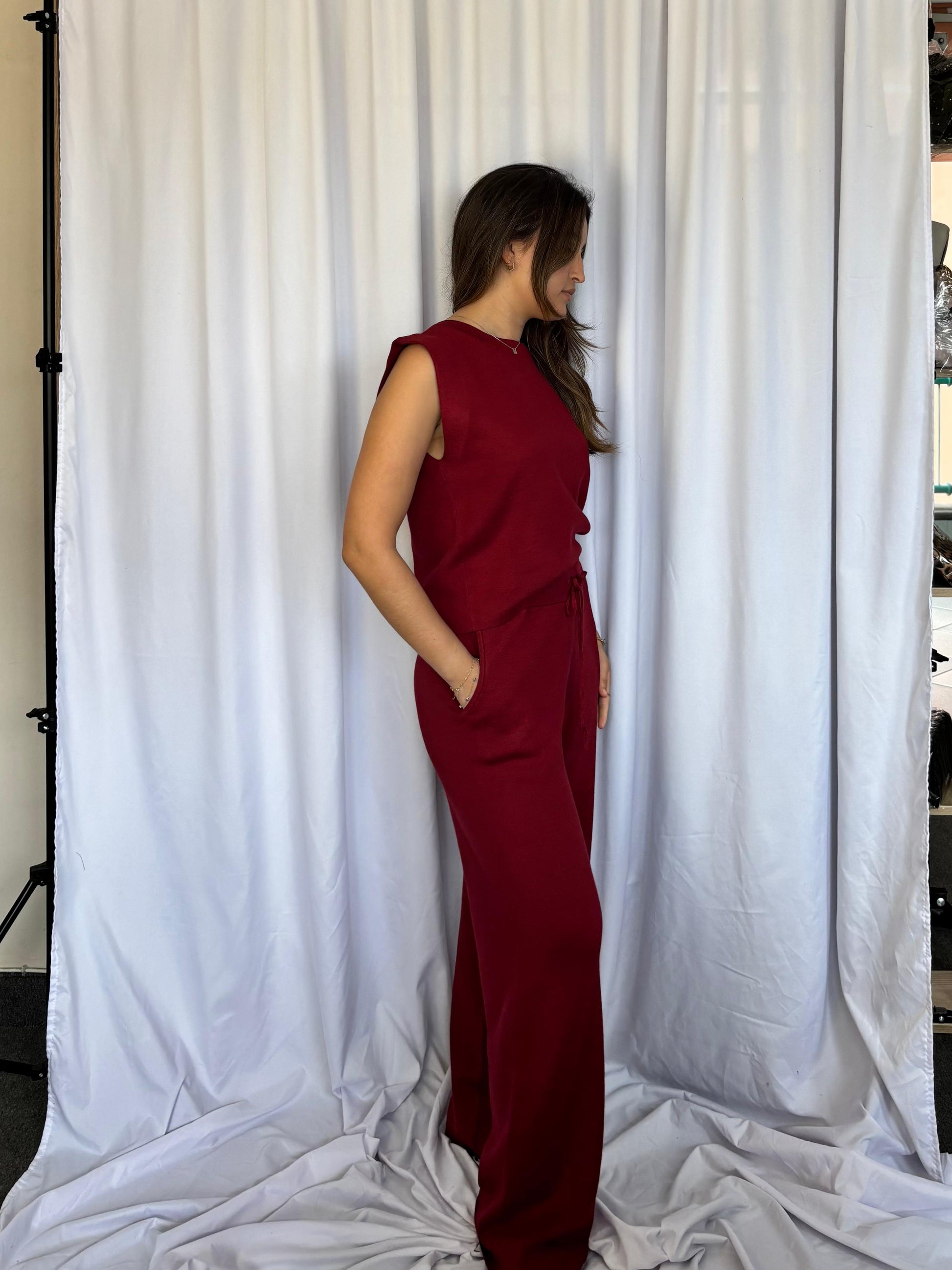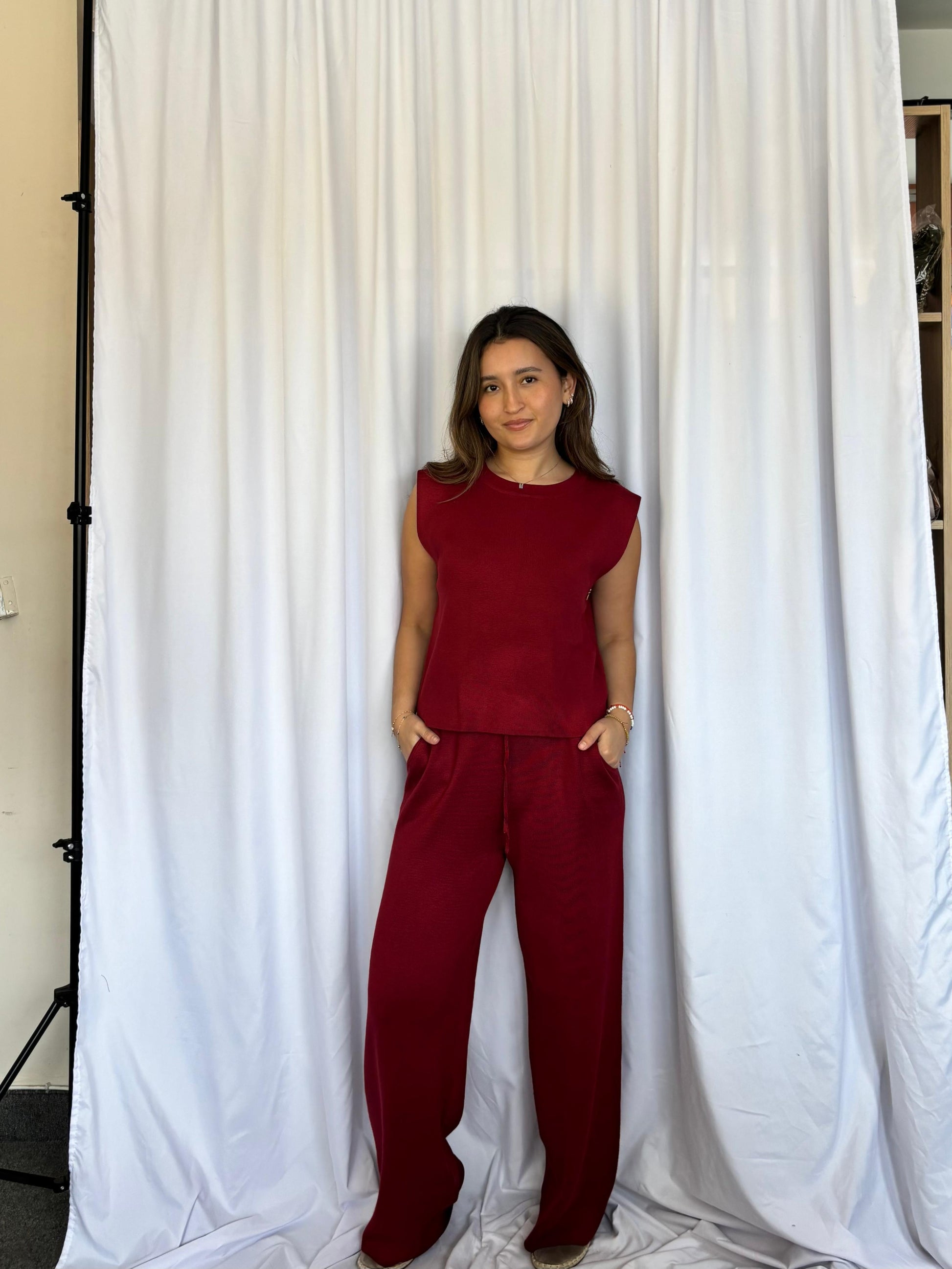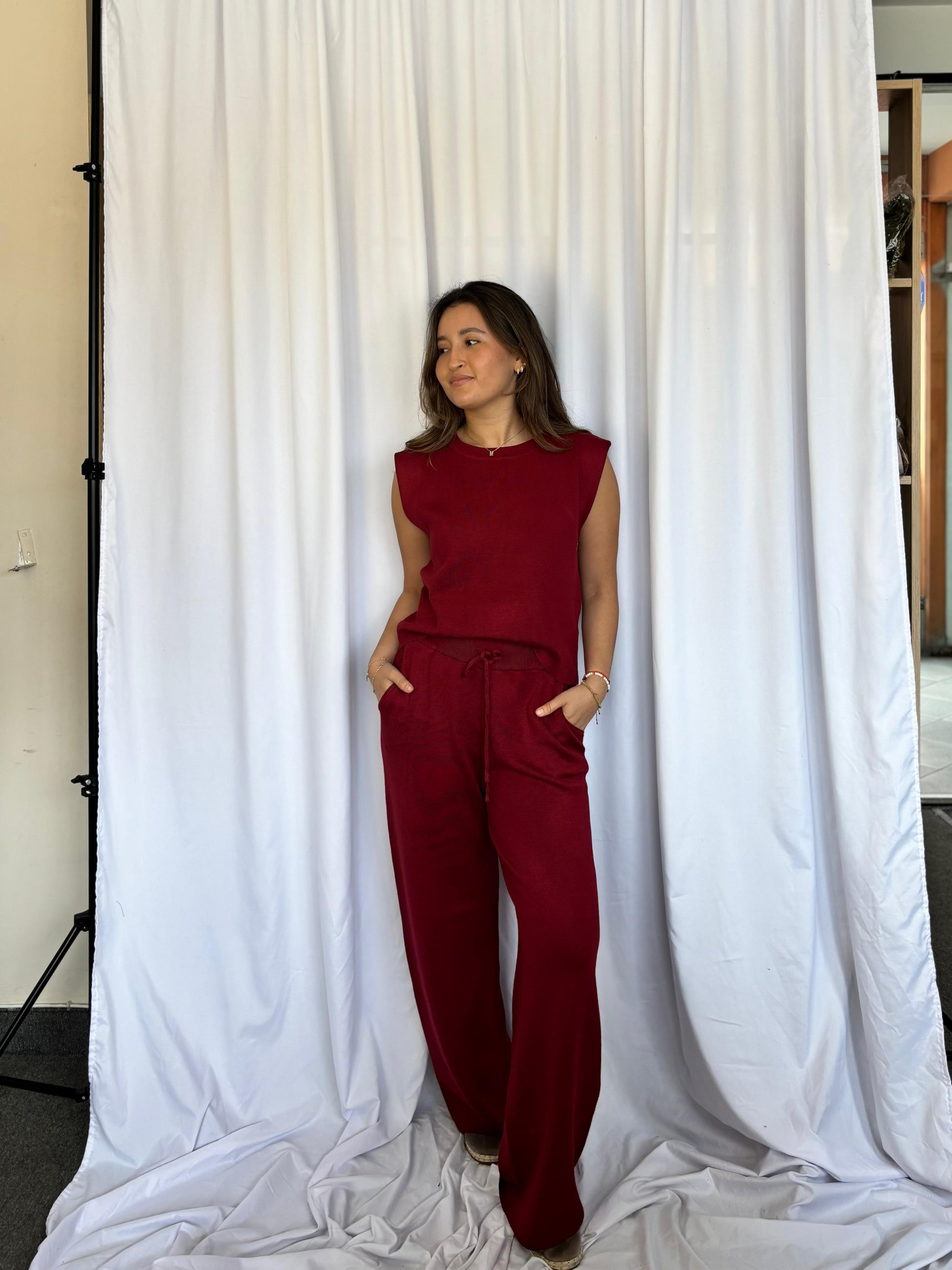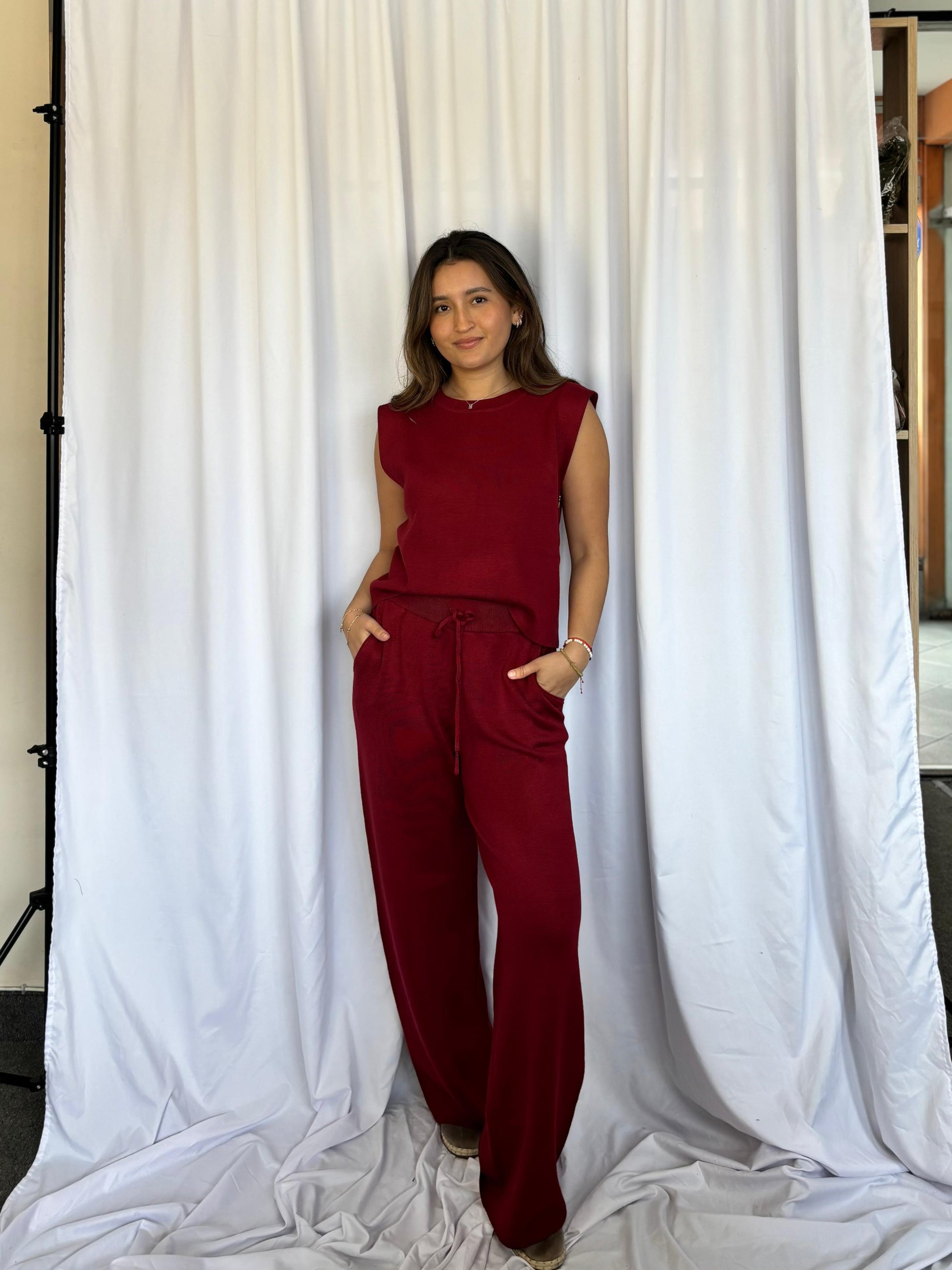 Conjunto tejido guinda, blusa manga cero y pantalón.