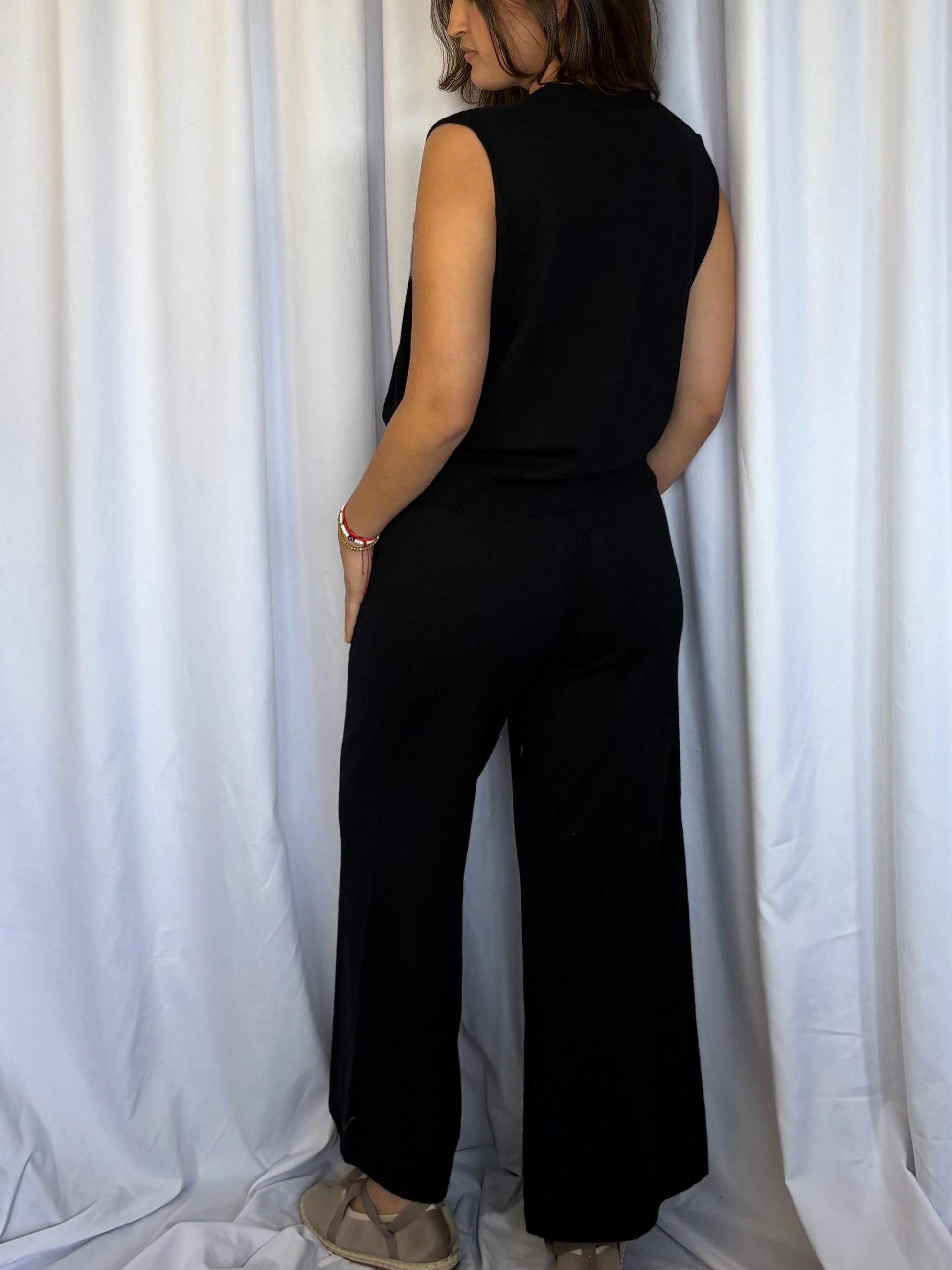 Conjunto tejido negro, chaleco con estampado de flores y pantalón tejido a la cintura.
