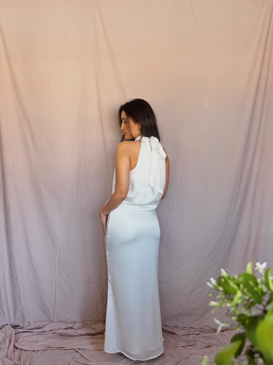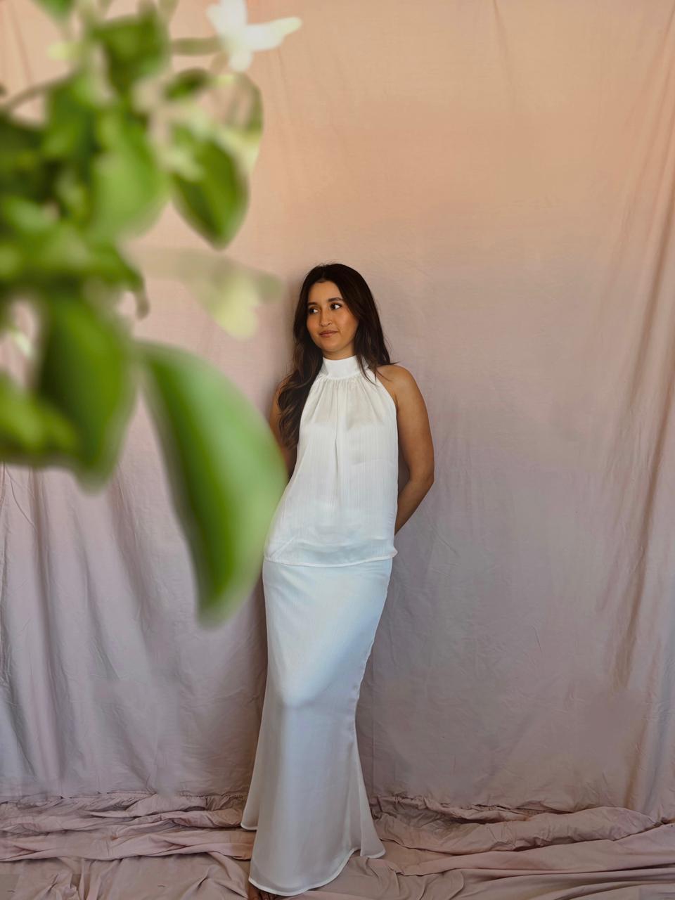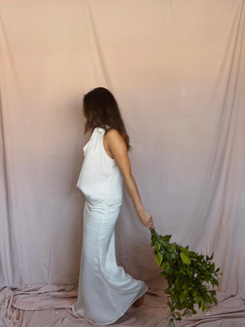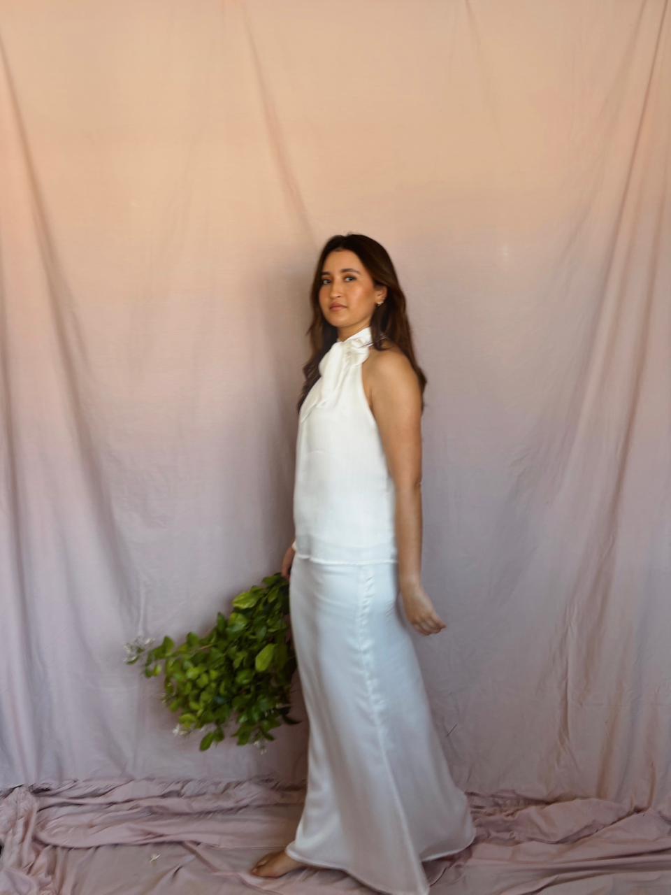Nuestra falda Julia es una prenda de corte asirenado, una falda larga de satín hindú con un brillo mate.