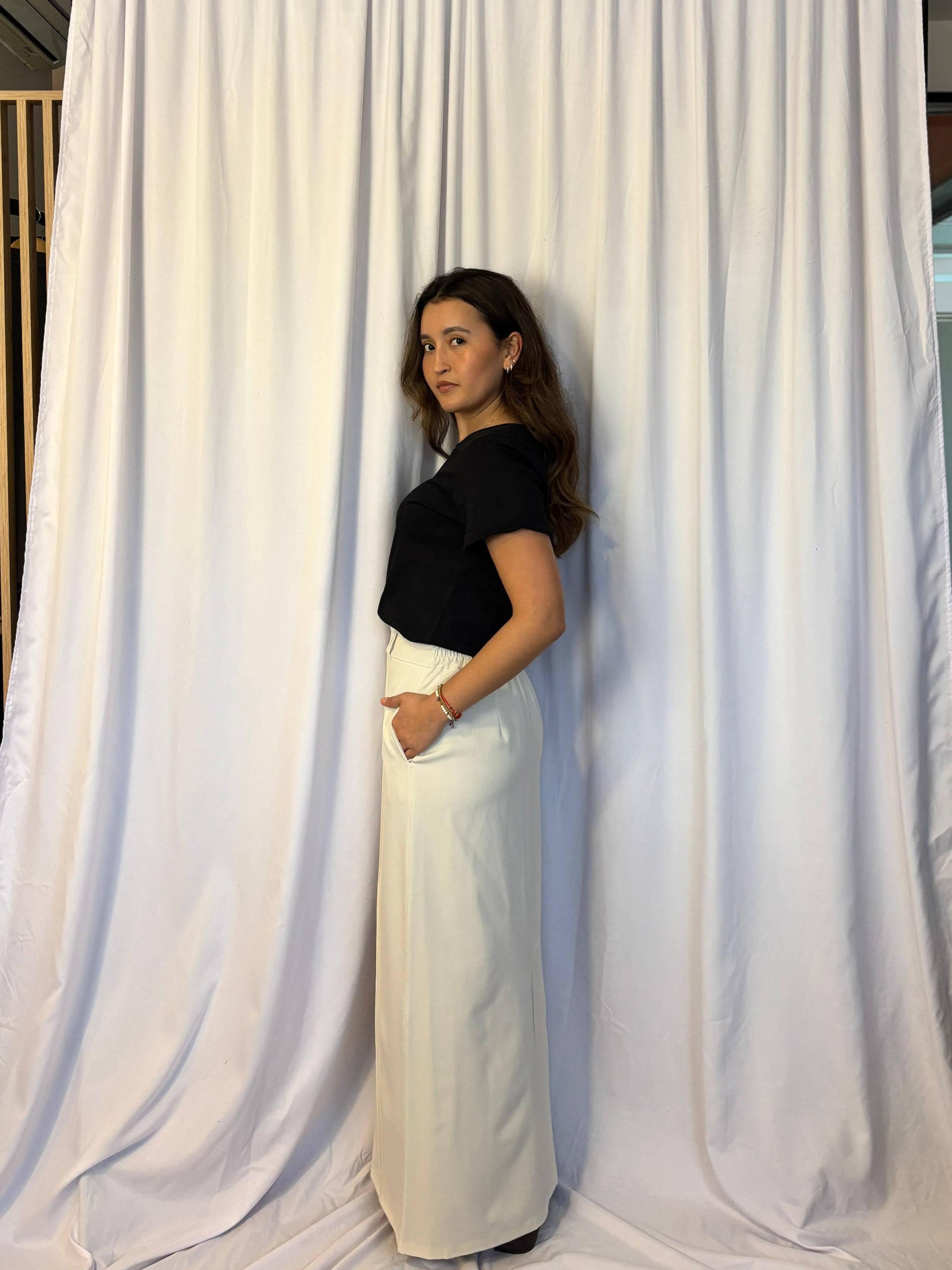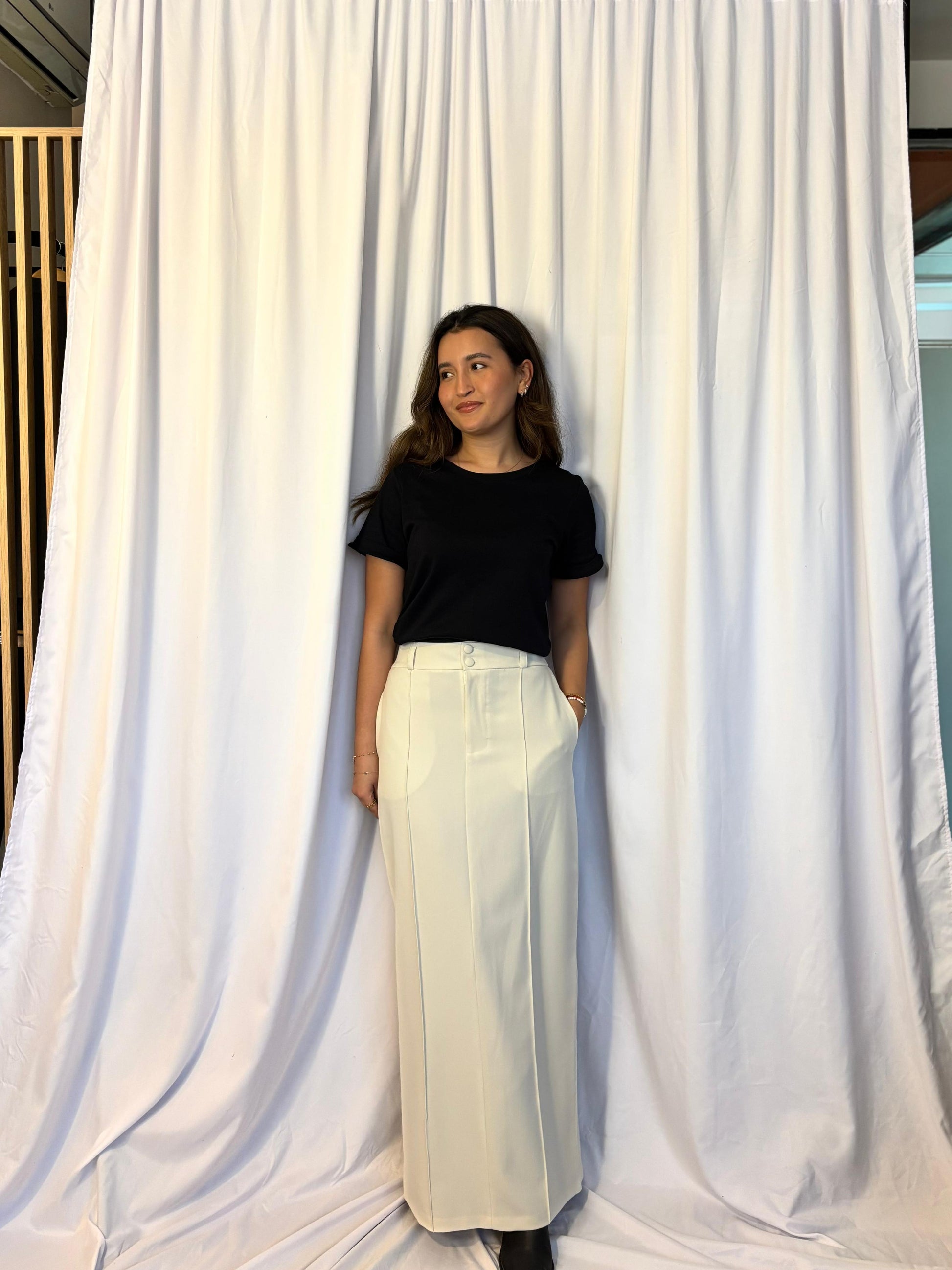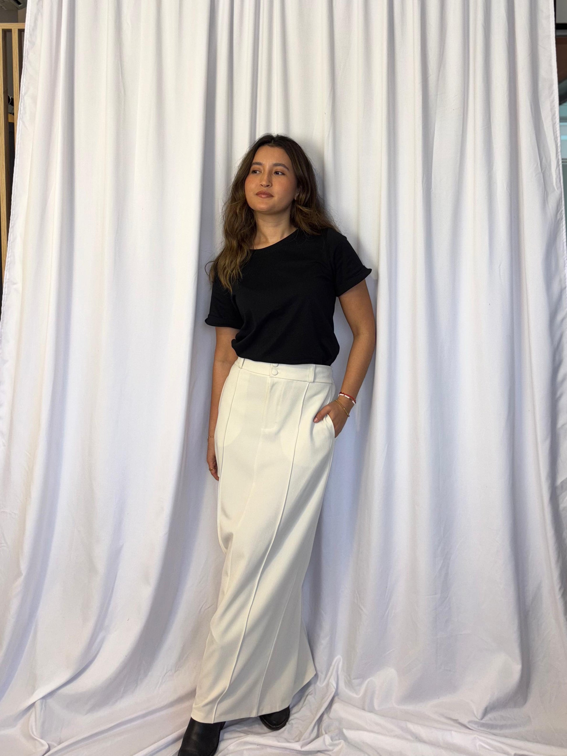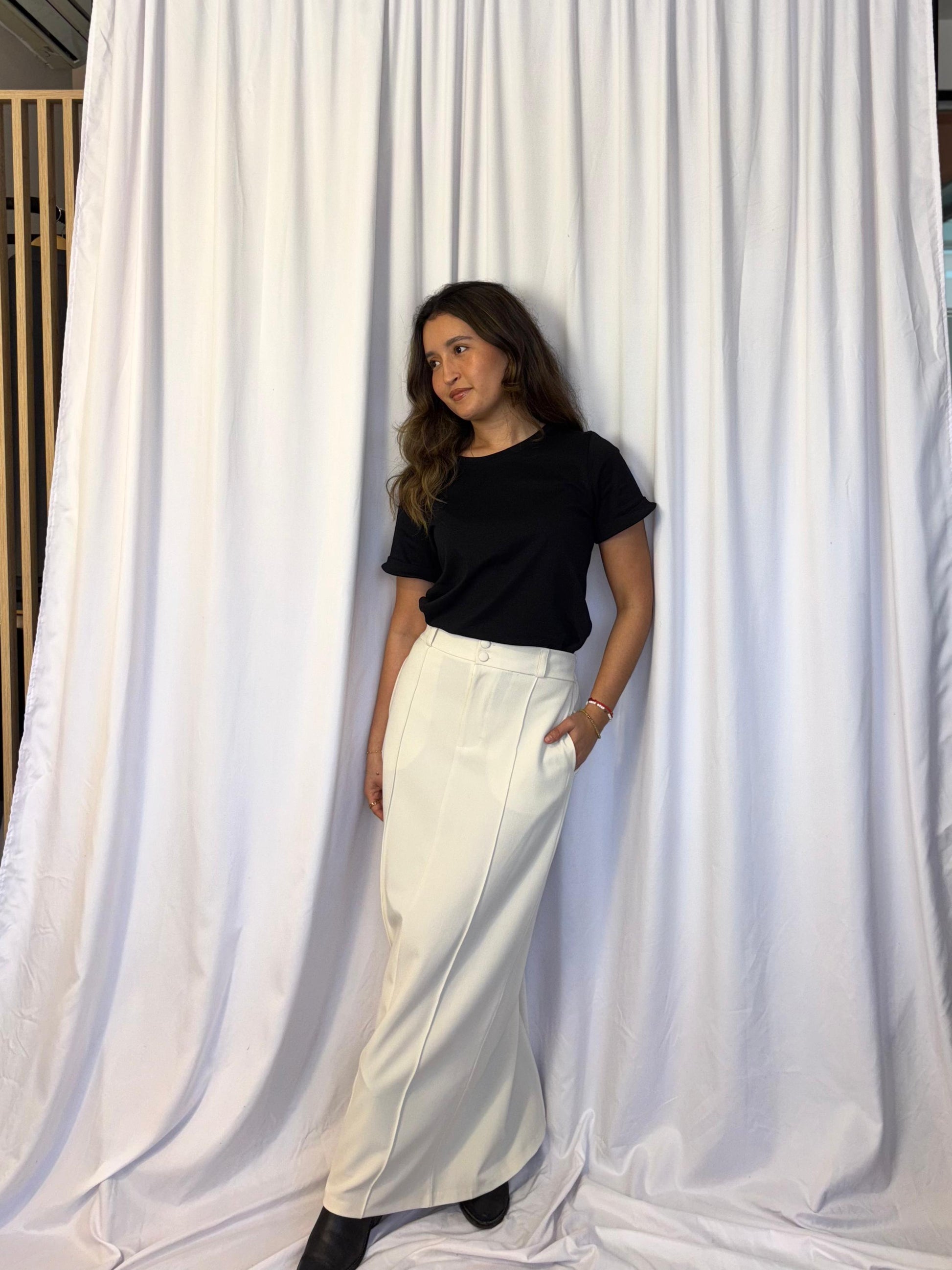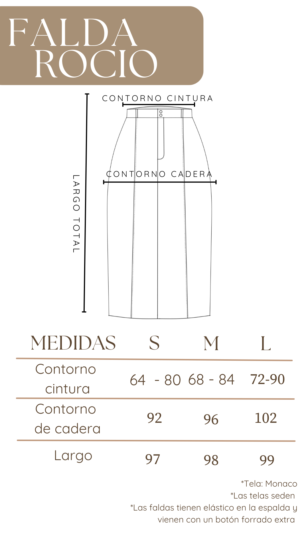 Nuestra falda sastre Rocío es una prenda de corte recto, ajuste confortable y tiro a la cintura. Tiene un corte largo que estiliza la silueta gracias a sus costuras en el centro de ambas piernas y lleva una abertura en el posterior. Ideal para combinar con tacones en punta, botas altas o zapatillas, ya sea en la oficina o en otras ocasiones, esta falda se adapta a ti y a tu ritmo.