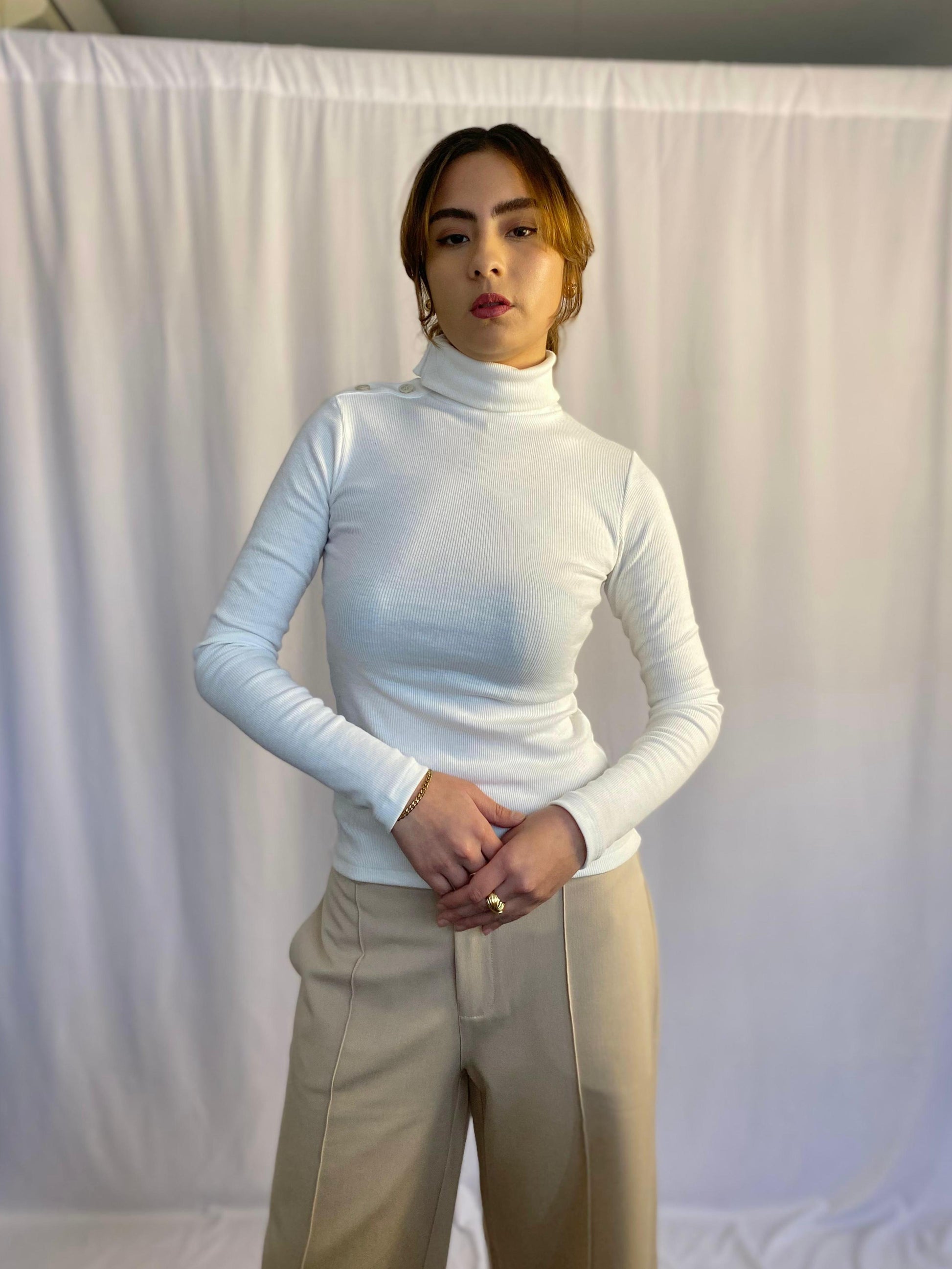 Nuestro polo Atenea es el básico de invierno esencial, gracias a su versatilidad. Podrás usarlo de 2 formas, con cuello alto o bajo, gracias a los botones ubicados en el hombro.