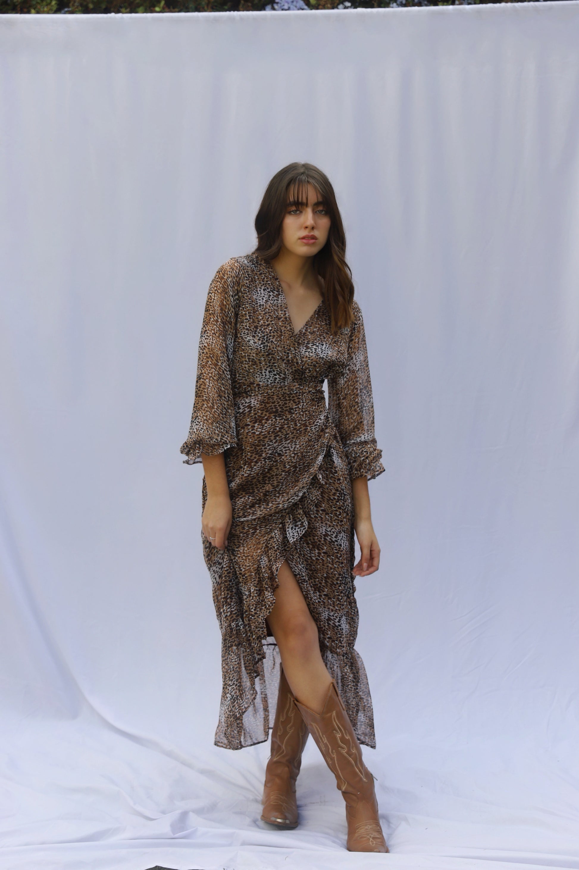 Nuestro vestido Magnolia esta confeccionado con una tela de gasa en un estampado animal print en tonos marrones y beige. Presenta un escote en V, con su silueta envolvente se ajusta a la cintura y cae delicadamente, creando una forma favorecedora y sofisticada.